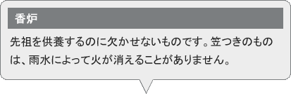 カロートとは、ご遺骨を納める場所のことです。ふだんは目に見えない設備ですが、お墓の構成上一番大切ともいえる場所です。石碑の基礎的な性格から、従来はコンクリートで施工していましたが、最近ではご遺骨を納める重要な設備との認識により、御影石で施工される方も多いようです。